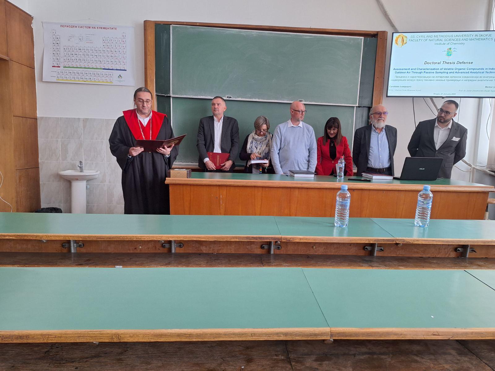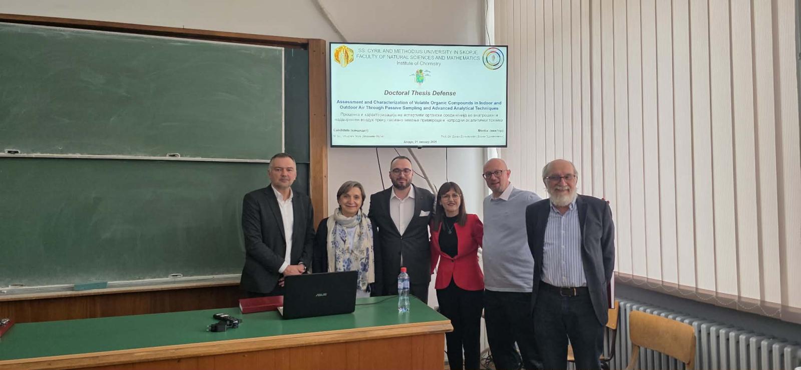 Më 21 janar 2026, asistenti ynë, Ass. Vllaznim Mula, përfundoi me sukses mbrojtjen publike të disertacionit të doktoratës në Universitetin “Shën Kirili dhe Metodi”, Fakulteti i Shkencave Natyrore dhe Matematike, Departamenti i Kimisë.